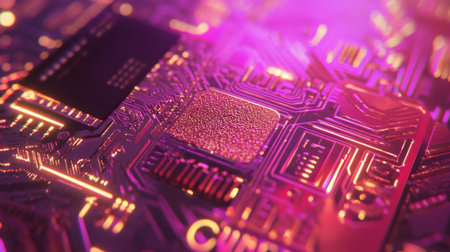 This close-up image showcases a vibrant microchip circuit board, emphasizing intricate details and colorful lighting. Ideal for technology themes.