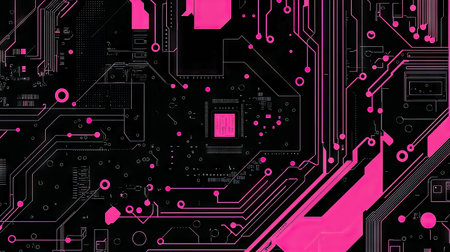 Close-up view of a detailed circuit board, showcasing a complex network of interconnected lines and components, presented in a vibrant pink and black color scheme. The intricate pattern creates a visually striking and technological aesthetic.