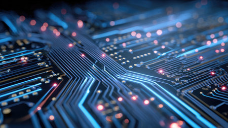 Explore an abstract close-up view of a blue circuit board, showcasing glowing lights and intricate pathways that embody the essence of advanced technology and digital connectivity.