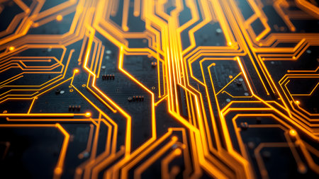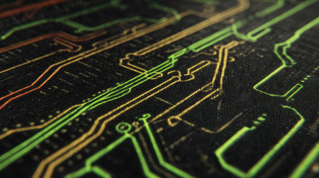 A striking close-up of intricate circuit board patterns in vivid green and orange on a dark background, ideal for technology and innovation themes.