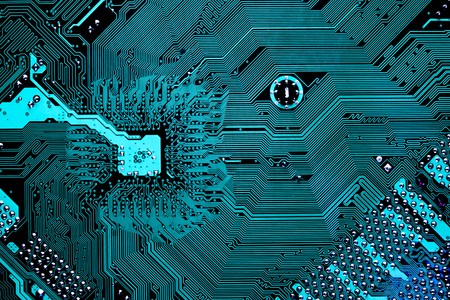A close-up abstract view of a circuit board with glowing blue lines and a blurred background. The image has a futuristic feel, suggesting technology and connectivity.