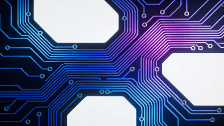 Neon circuit board showcases intricate blue and green pathways, highlighting modern engineering artistry in a flat design.