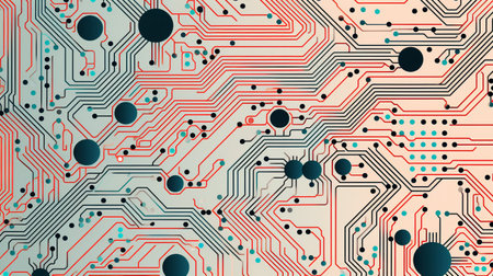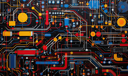 An AI generated illustration of a vibrant circuit board background with colorful electrical components