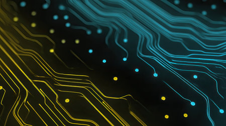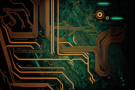 This circuit board, set against a dark backdrop, is enhanced by its gold and copper lines, imparting a futuristic touch—a remarkable circuit board background. Created with generative AI tools