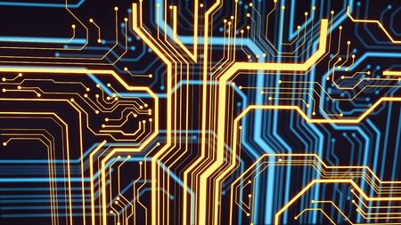Circuit board futuristic server code processing. Orange, blue technology background with bokeh. 3d Illustration