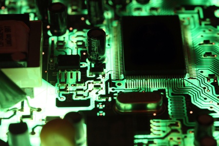Creative concept of modern technology, inside an electronic device. Electronic circuit board close up in low key. Selective focus