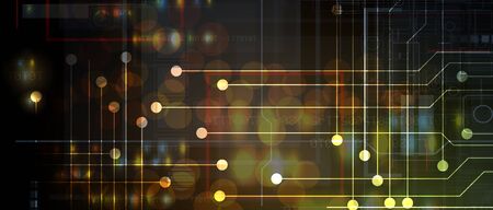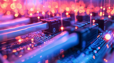 Vibrant minimalistic of internet wires and circuit board in neon lighting - concept of connectivity and technology. Background.
