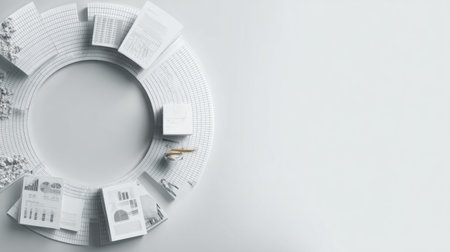 Charts, graphs, and documents arranged in a circular layout highlight data organization and presentation in a minimal space with a grid background