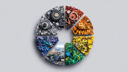 This vibrant wheel showcases a variety of industrial items, highlighting themes of recycling and sustainability in modern manufacturing environments.