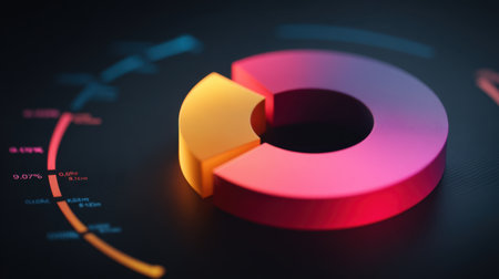 Vibrant 3D pie chart with gradient of pink and orange colors, showcasing data visualization. chart is set against dark background, enhancing its modern and sleek appearance
