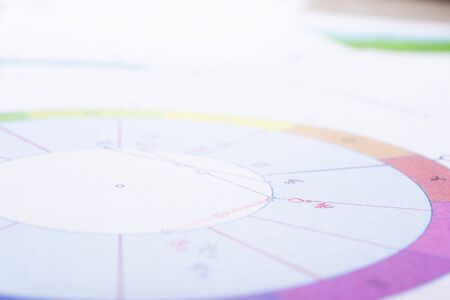 The desktop of an astrologer. The magical mysterious atmosphere of the working environment of the predictor of the future. Printouts of astrological charts and tables scattered across the table.