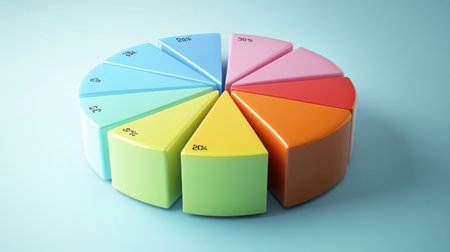 This colorful pie chart illustration features segments in various hues on a soft blue background, perfect for use in business, marketing, or creative presentations.
