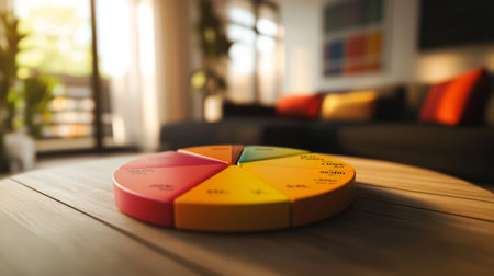 A vibrant pie chart sits on a wooden table in a bright, modern interior. This image captures the essence of creativity and analytical thinking in a cozy workspace setting.