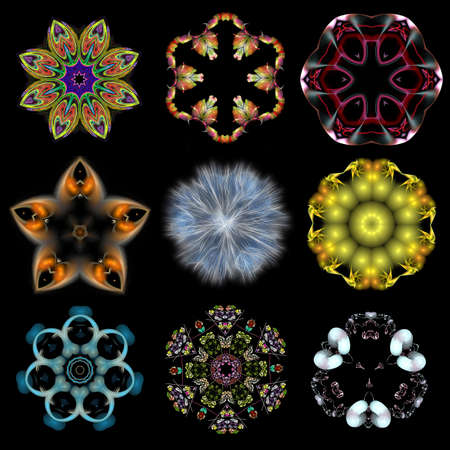 Set of abstract colored patterns on black isolated background. Fractal pattern. Kaleidoscope. Mandala.