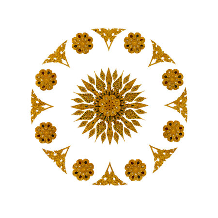 A gold and red ornamented circle with many gold and red ornaments. The circle is surrounded by a white background