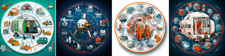 collage of 4 photos. The icons represent various emergency situations in a noble and realistic style. Subjects depicted include firefighters, paramedics, police officers and others.