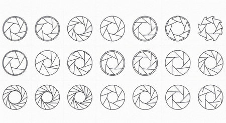 A grid of hand-drawn illustrations showing camera aperture blades in different states of opening and closing, creating circular patterns.