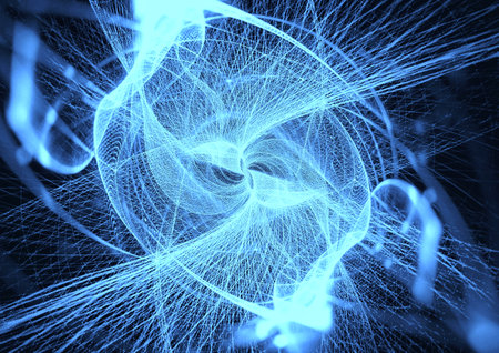 Abstract blue light lines on a black background. Shallow depth of field. An unusual glowing of chaotically stacked thin wires, celestial, light blue, neon harness, illuminated wire