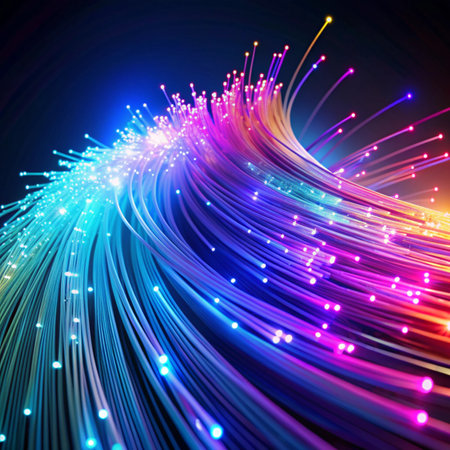 Vibrant blue and orange fiber optic strands emit a soft glow, intertwining against a black backdrop, symbolizing cutting-edge digital connectivity and information fl