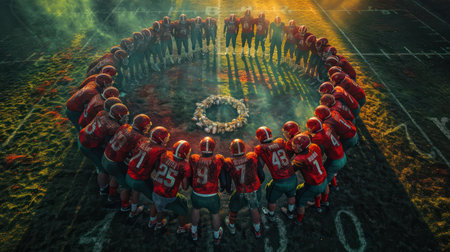 A group of football players are huddled together in a circle. Concept of camaraderie and teamwork among the players
