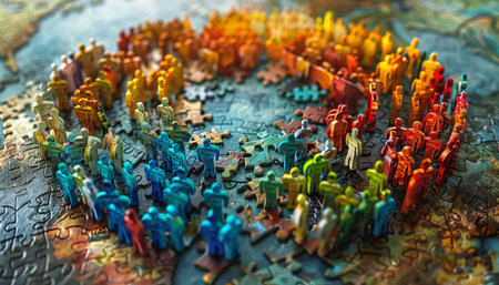 Diverse group of people standing in circle with painted world map on ground, symbolizing unity, connection, and global awareness