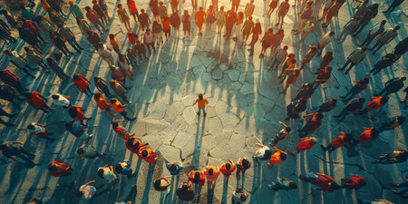 A stunning aerial view of a diverse crowd surrounding a single figure, showcasing unity, individuality, and vibrant colors in a modern artistic design.