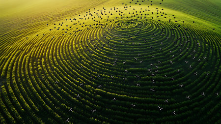 A mesmerizing aerial view captures birds soaring above lush spiraled fields.