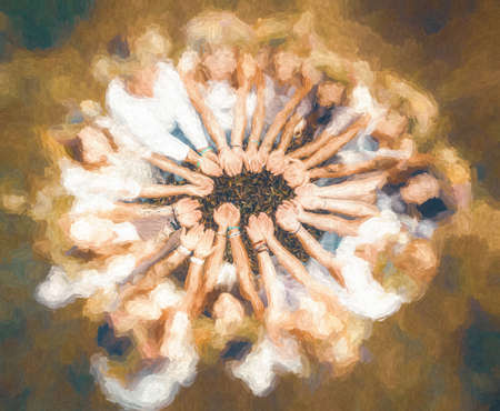Hands of girls form a circle. Ceremony space. Painting effect.