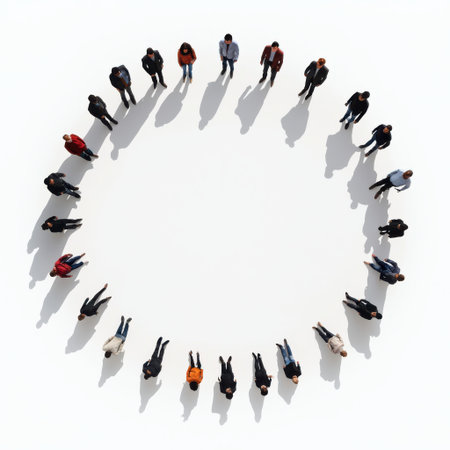 Diverse group of people in a circular arrangement on white background casting shadows in a creative and collaborative team setting concept