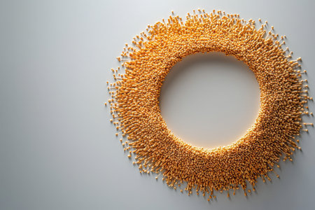 wellness food. A unique artistic arrangement of quinoa seeds forming a circular pattern on a clean white surface. A creative representation of whole grains and healthy superfoods.
