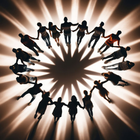 Group of people from various backgrounds standing in a circle on an expansive terrain, with shadows stretching towards the center, creating a sense of connection and community