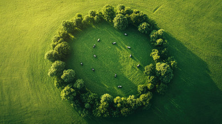 Green dairy farm island with open fields, trees, and cattle, top view, with space for copy.