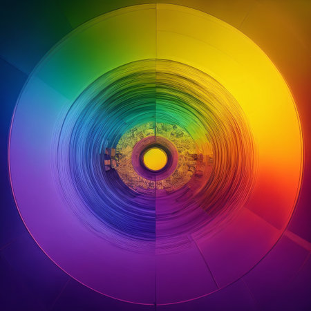 A spinning wheel a vibrant rainbow spectrum with radiating light flares against a stark black background.