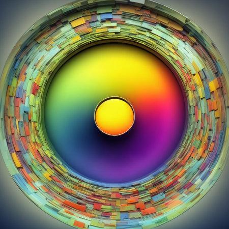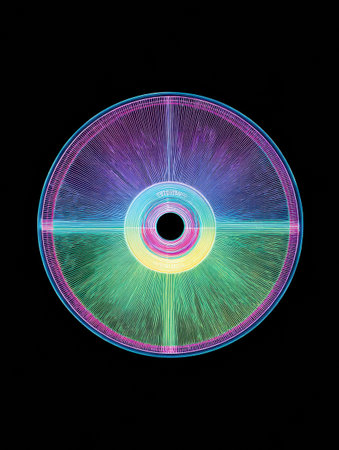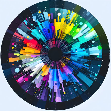 Intricate design showing an abstract circular pattern with colorful lines emanating from a central point, symbolizing data flow and connectivity.
