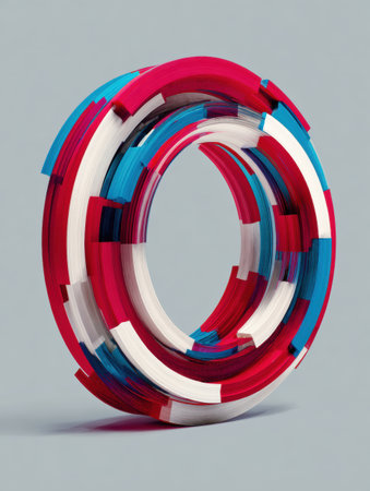 A striking abstract sculpture features a circular form made of interlocking segments in vibrant red, white, and blue, showing modern artistic expression.
