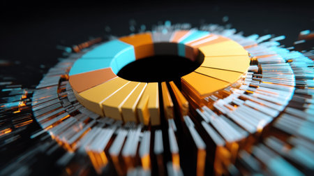 A D donut chart with vivid color segments spinning in space, showcasing data insights, against a minimalist background with subtle shadows.