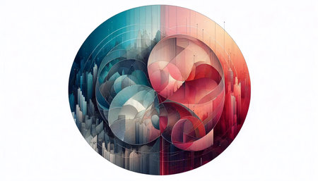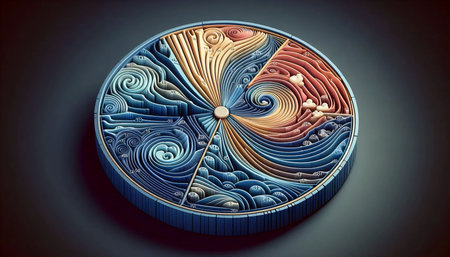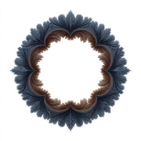 An elegant circular design featuring intricate feathery elements in contrasting warm and cool tones, ideal for backgrounds, digital art, or decorative uses.