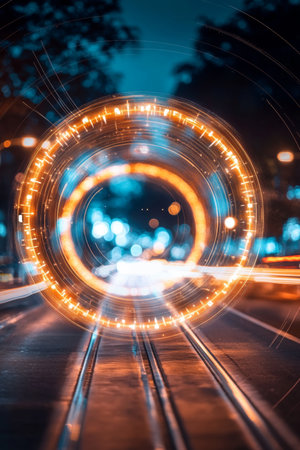 Dynamic light trails create an energetic overlay in a mesmerizing circular pattern