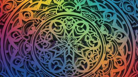 A layered rainbow mandala featuring intricate geometric patterns and ornamental designs, creating a sense of depth with shadow effects.