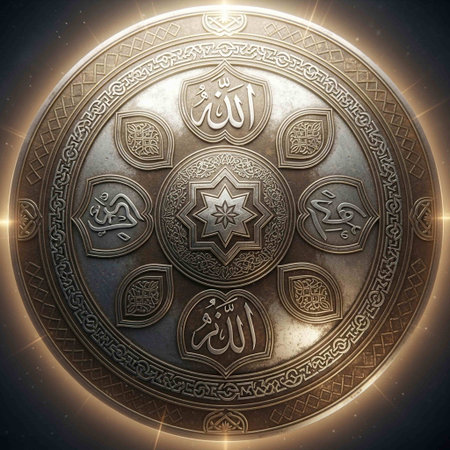 An intricately designed metallic shield or medallion featuring prominent Islamic calligraphy and geometric patterns, radiating a soft, spiritual glow against a dark background.