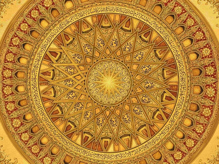 An elaborate Islamic geometric mandala featuring intricate patterns and Arabic calligraphy in shades of blue, green, gold, and cream.
