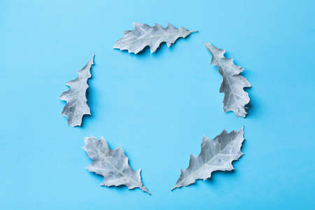 Creative Christmas winter autumn fall day composition with decorative dried leaves. Flat lay, top view, copy space, still life blue pastel background for greeting card