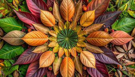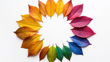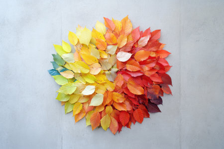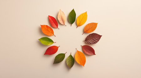 A captivating circular arrangement of autumn leaves displays a beautiful gradient of colors from green to vibrant red, set against a soft neutral background, perfect for seasonal themes.