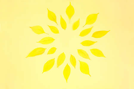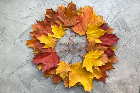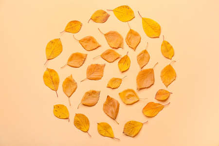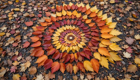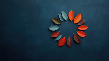 This image features an artistic circular arrangement of vibrant autumn leaves in warm tones on a neutral background, perfect for celebrating the beauty of seasonal change.