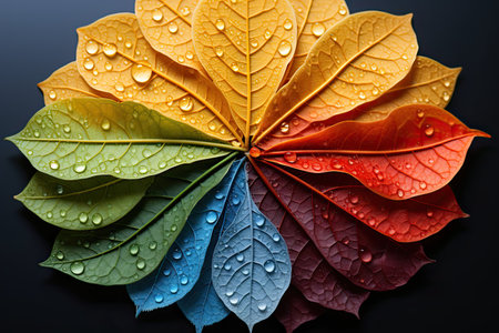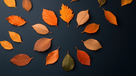 Explore the elegant arrangement of colorful leaves on a dark textured background, perfect for autumn-themed projects, decorations, and artistic inspirations.