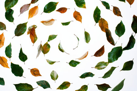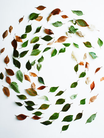 A colorful swirl of green and brown leaves contrasts with a white background, capturing the essence of natures transition.