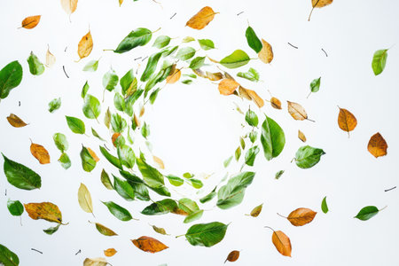 Green and brown leaves are caught in a whirlwind, spiraling toward the center against a white backdrop, capturing the essence of autumn movement and change.