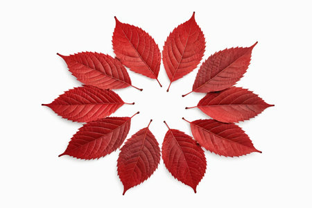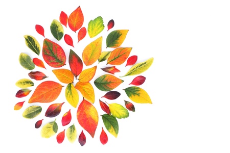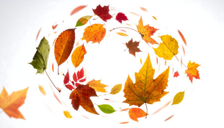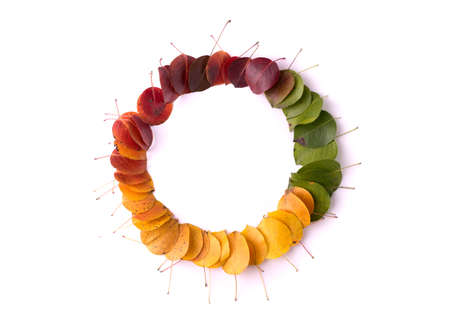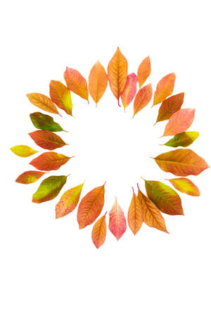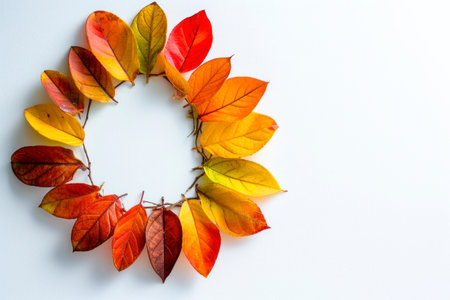 Autumn leaves with warm colors forming a circle on a white background, creating a beautiful seasonal decoration