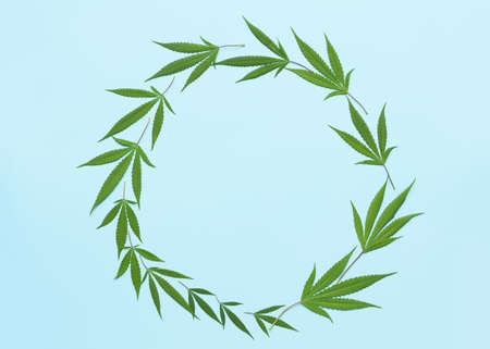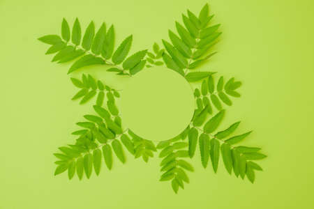 Fresh natural green leaves alligned in circle making a natural frame on pastel green background. Seasonal card or invitation. Thanksgiving or Autumn banner or artistic design.