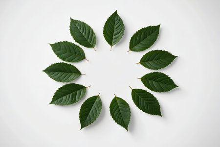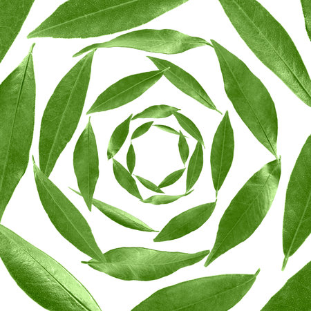 This image showcases a meticulously arranged pattern of green leaves. The leaves are carefully placed in a circular formation, creating a visually appealing design. The leaves vary in size and shape, adding to the natural beauty and complexity of the arrangement. The background is plain white, which highlights the vibrant green color and intricate details of the leaves.